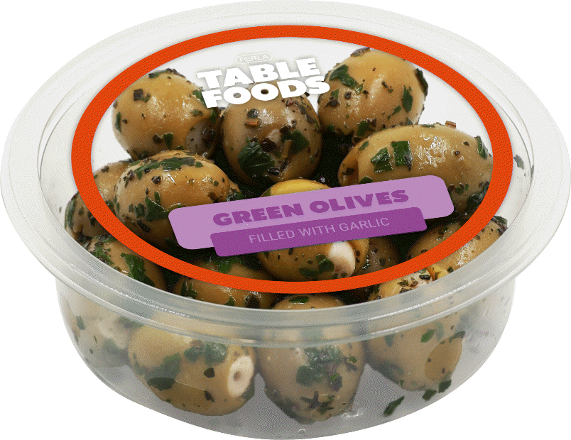Savor the bold combination of crisp green olives filled with garlic. This flavorful blend offers a savory, aromatic kick, making it a perfect snack or a great addition to salads and antipasto platters.