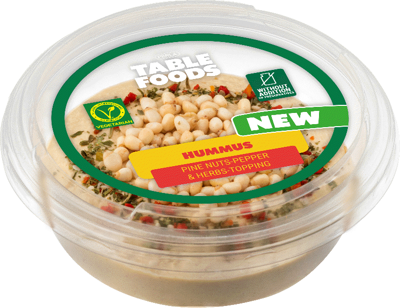 Smooth hummus enhanced with crunchy pine nuts, a hint of pepper, and herbs. A deliciously textured and aromatic spread perfect for dipping or complementing your favorite dishes. Great for adding a nutty, savory touch to any snack.