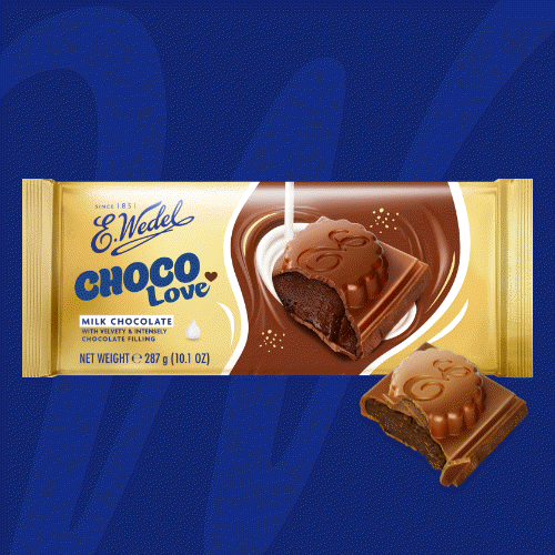 Discover the full pleasure of E.Wedel Choco love Milk Chocolate with chocolate filling when served at 21–22°C. At this temperature, it reaches its richest flavour and perfect harmony as the filling transforms into a delicate mousse that melts in the mouth. Elegant and indulgent, it is also an ideal gift for special occasions.