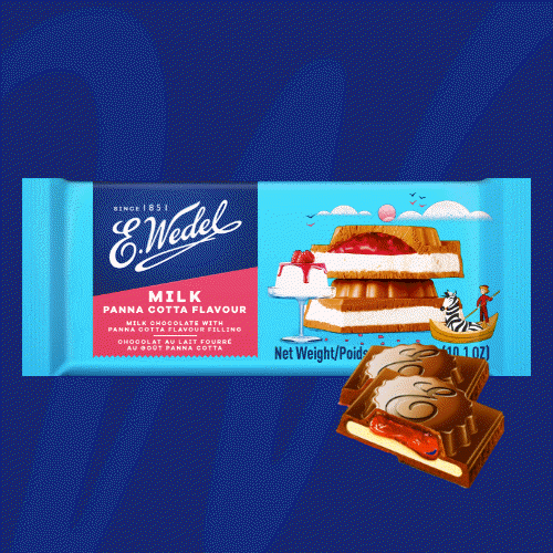 E.Wedel Milk Chocolate with Panna Cotta combines the creamy sweetness of milk chocolate with a smooth, delicate panna cotta filling. The light, vanilla-flavoured centre perfectly complements the rich chocolate. Together, they create a harmonious and indulgent dessert-inspired treat.