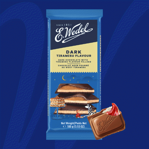 E.Wedel Dark Chocolate with Tiramisu Filling combines the bold flavour of dark chocolate with a creamy centre inspired by the classic Italian dessert. The filling, with notes of coffee and mascarpone, perfectly complements the intense cocoa. Every bite offers an indulgent treat that evokes the charm of an Italian café.