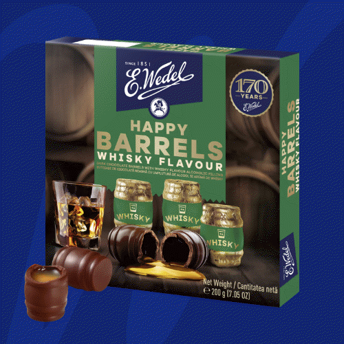E.Wedel Happy Barrels Whisky are barrel-shaped pralines with a rich, whiskey-flavoured centre. The smooth milk chocolate coating balances the bold, warming notes of whisky. This creates a sophisticated and satisfying treat for chocolate lovers.