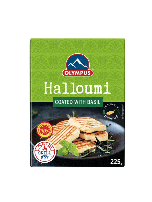 Halloumi Cheese P.D.O. Coated with basil is traditionally produced in Cyprus from the finest cow, sheep and goat milk.