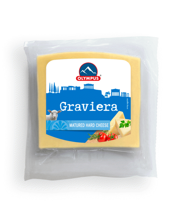 OLYMPUS Graviera hard cheese, made from pasteurized goat and sheep milk is one of Greece’s most beloved cheeses. It has a firm texture and rich, sweet, and buttery flavor with a slightly spicy finish.