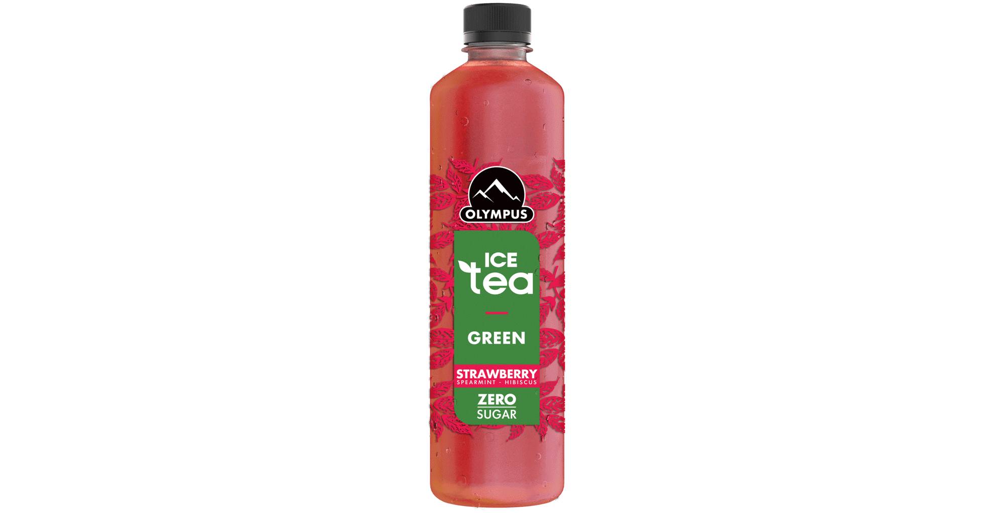 OLYMPUS ICE TEA Green Strawberry, a modern, fruity refreshment with aromatic tea notes. Available in three flavors, all with zero sugar, low calories, and no preservatives.