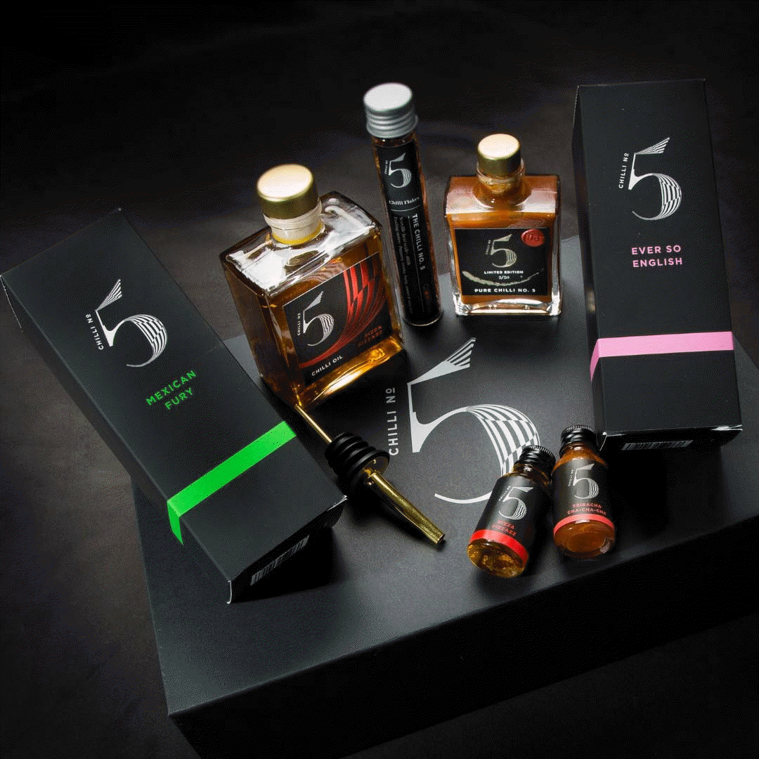 From Pizza Pizzazz – the Great Taste award-winning chilli oil to put on your table at home, to our iconic hot sauce bottles, a Limited Edition, a cheeky pouch for lunch, The Chilli Flakes, for a powerful hit of spicy heat, the Chilli No. 5 spices, and our Travel Size. All are in our Chilli No. 5 Gift Hamper often bought for Christmas so the recipient has a great selection of chilli products to enjoy any time throughout the holiday season.
